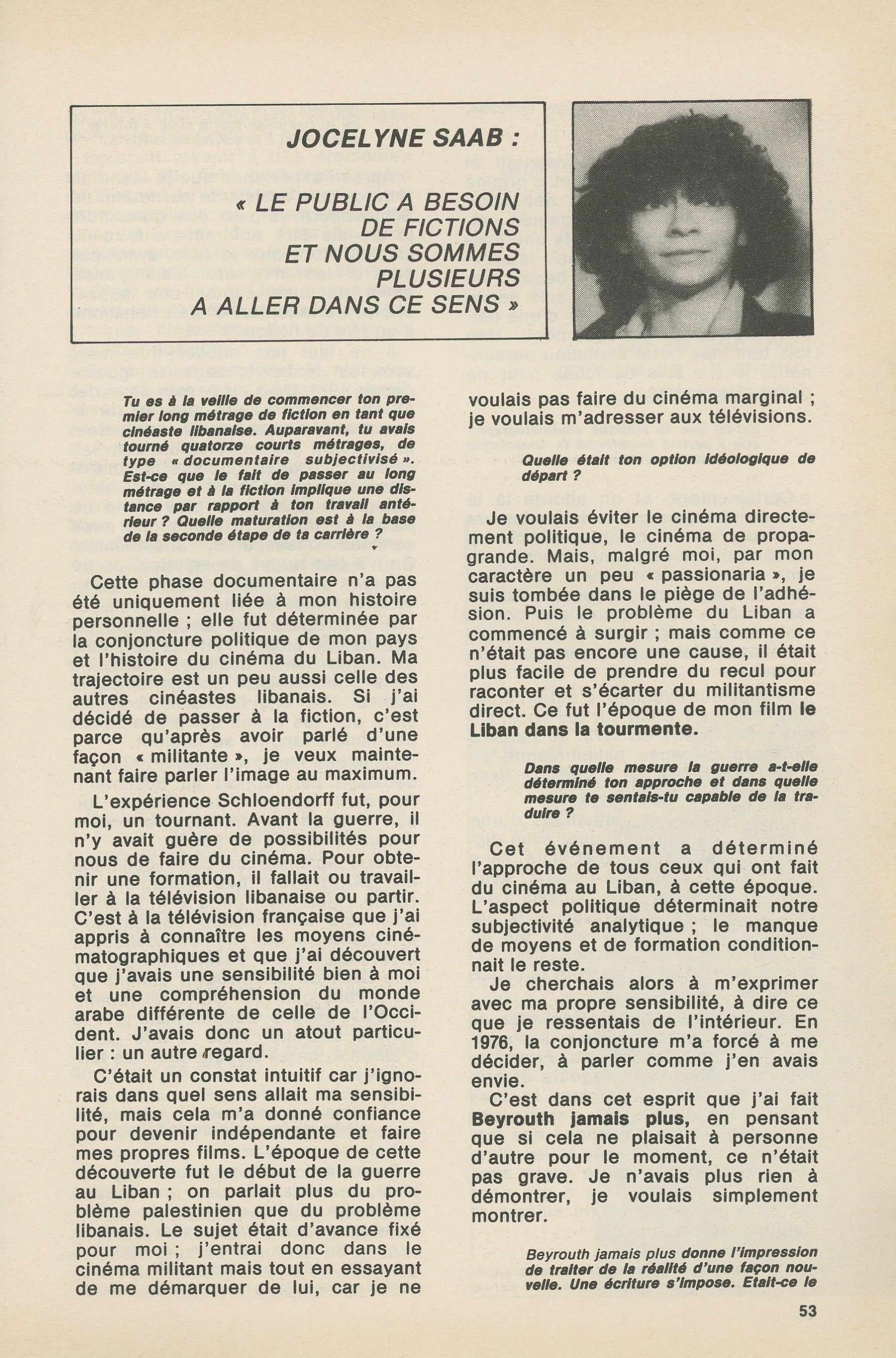 Mathilde Rouxel propose son travail sur le cinéma de Jocelyne Saab en ligne en accès libre, Jocelyne Saab La Mémoire indomptée (1970-2019) : https://hal.archives-ouvertes.fr/hal-02800812/document
