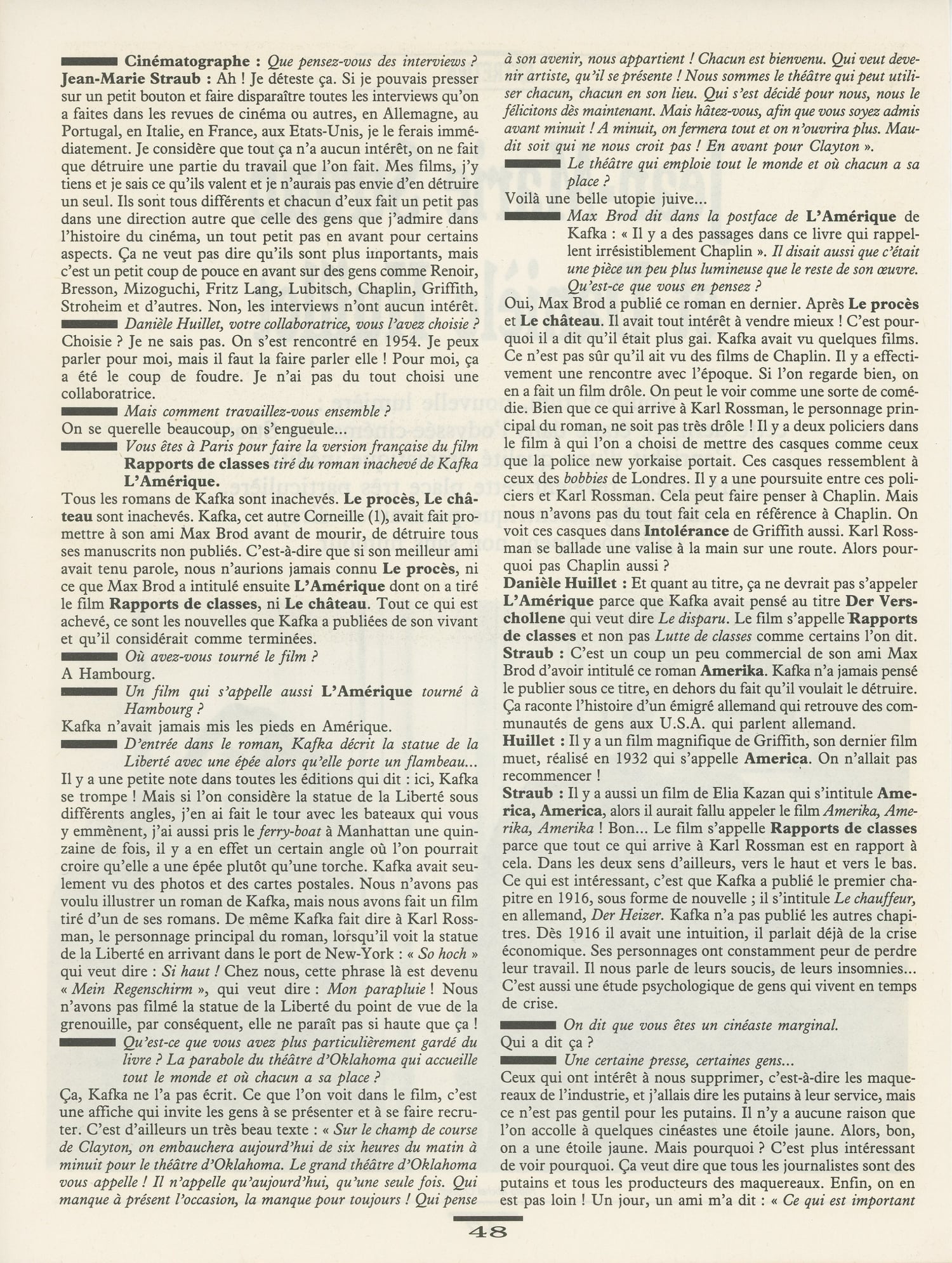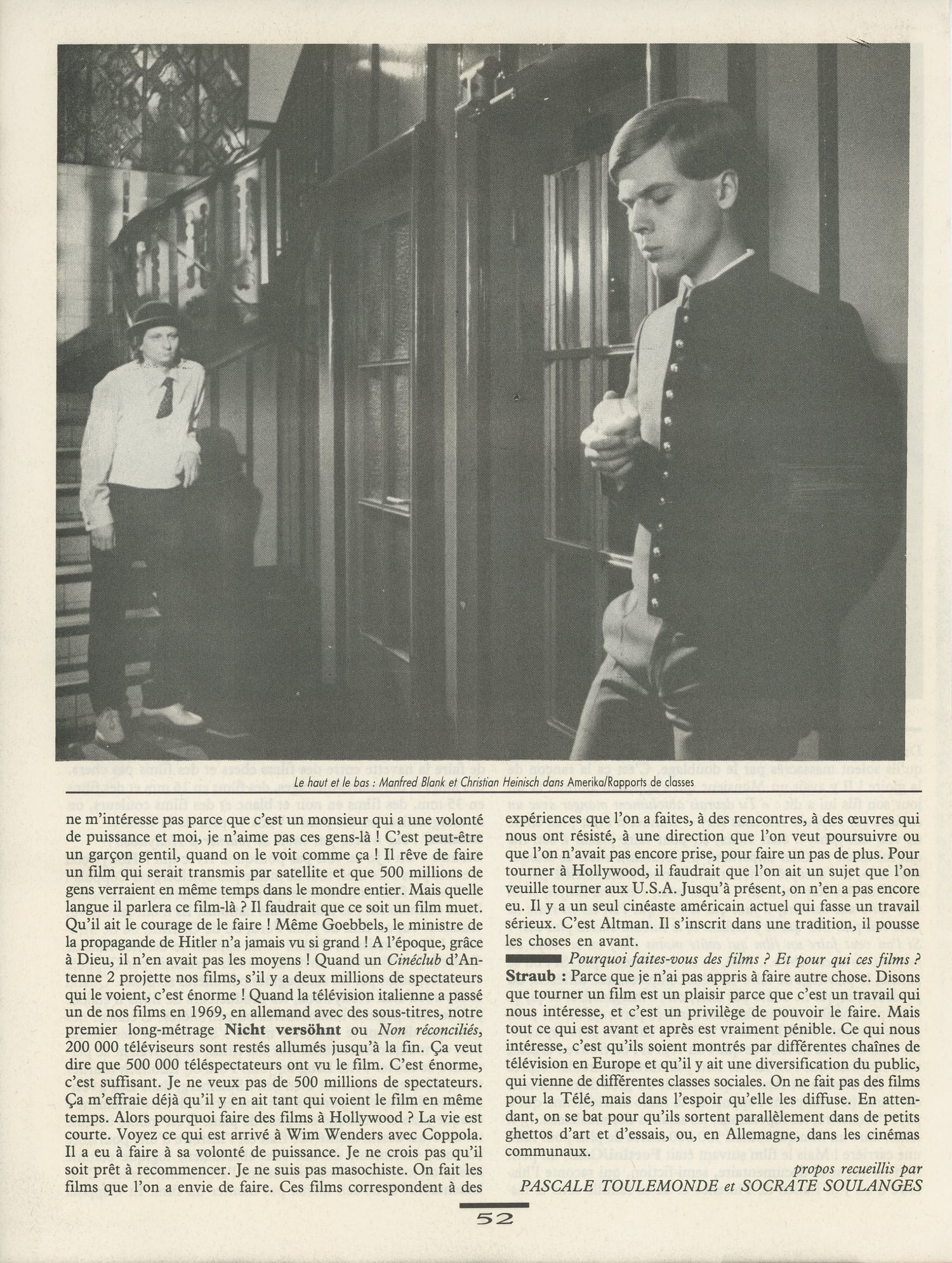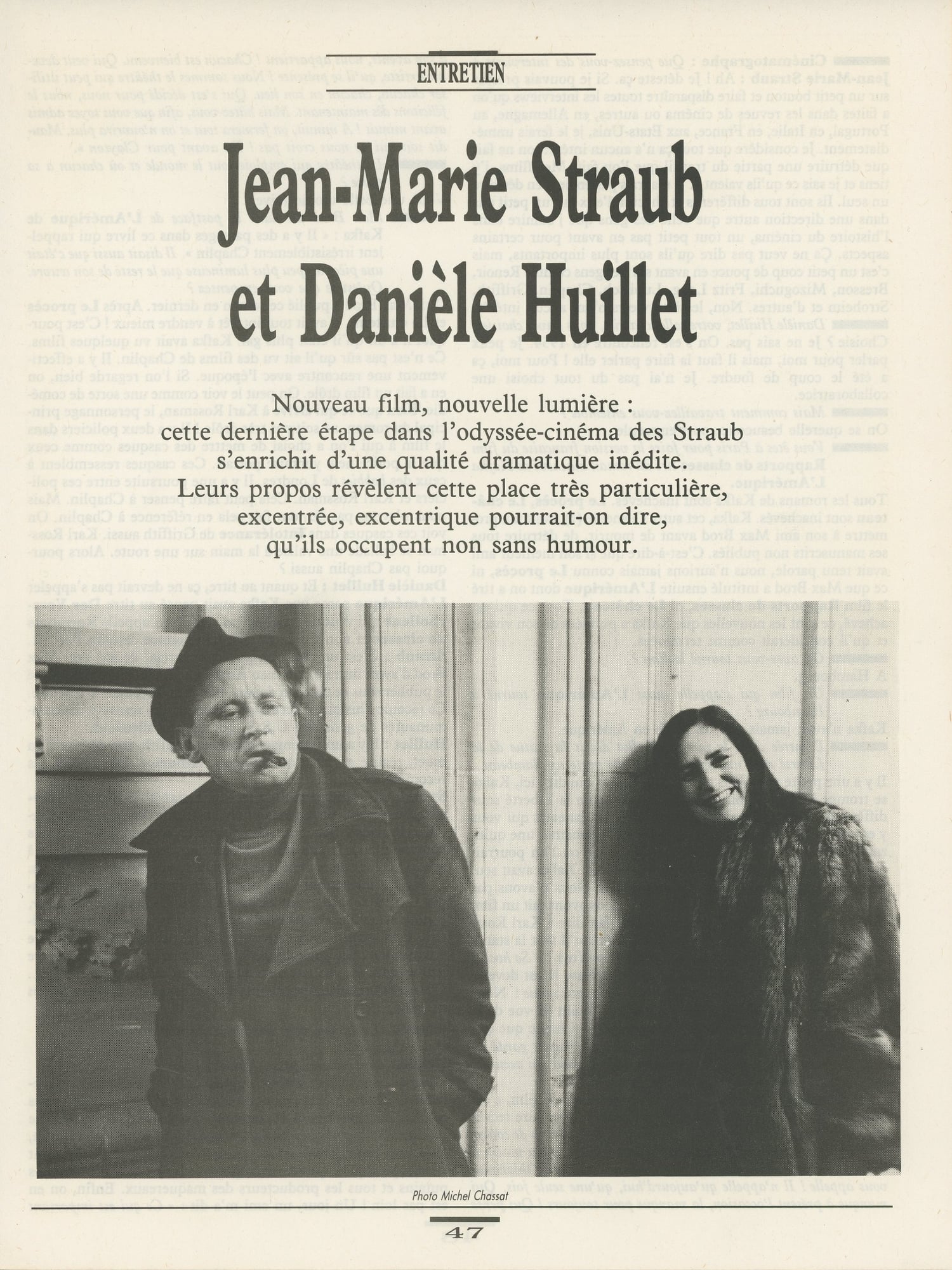 Straub et Huillet Entretien avec Jean-Marie Straub et Danièle Huillet Propos recueillis par Pascale Toulemonde et Socrate Soulanges, 1984 Texte initialemement paru en novembre 1984 dans la revue Cinématographe n°104