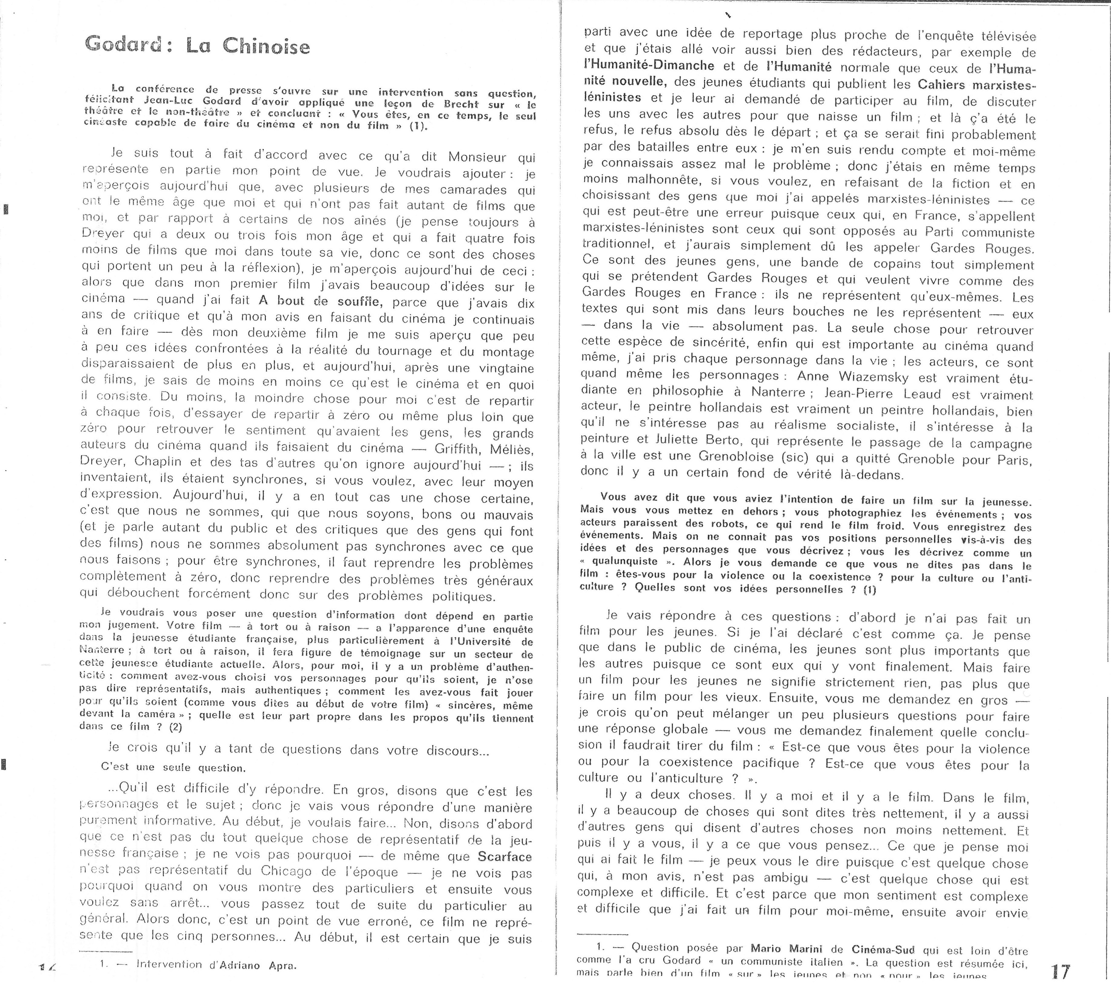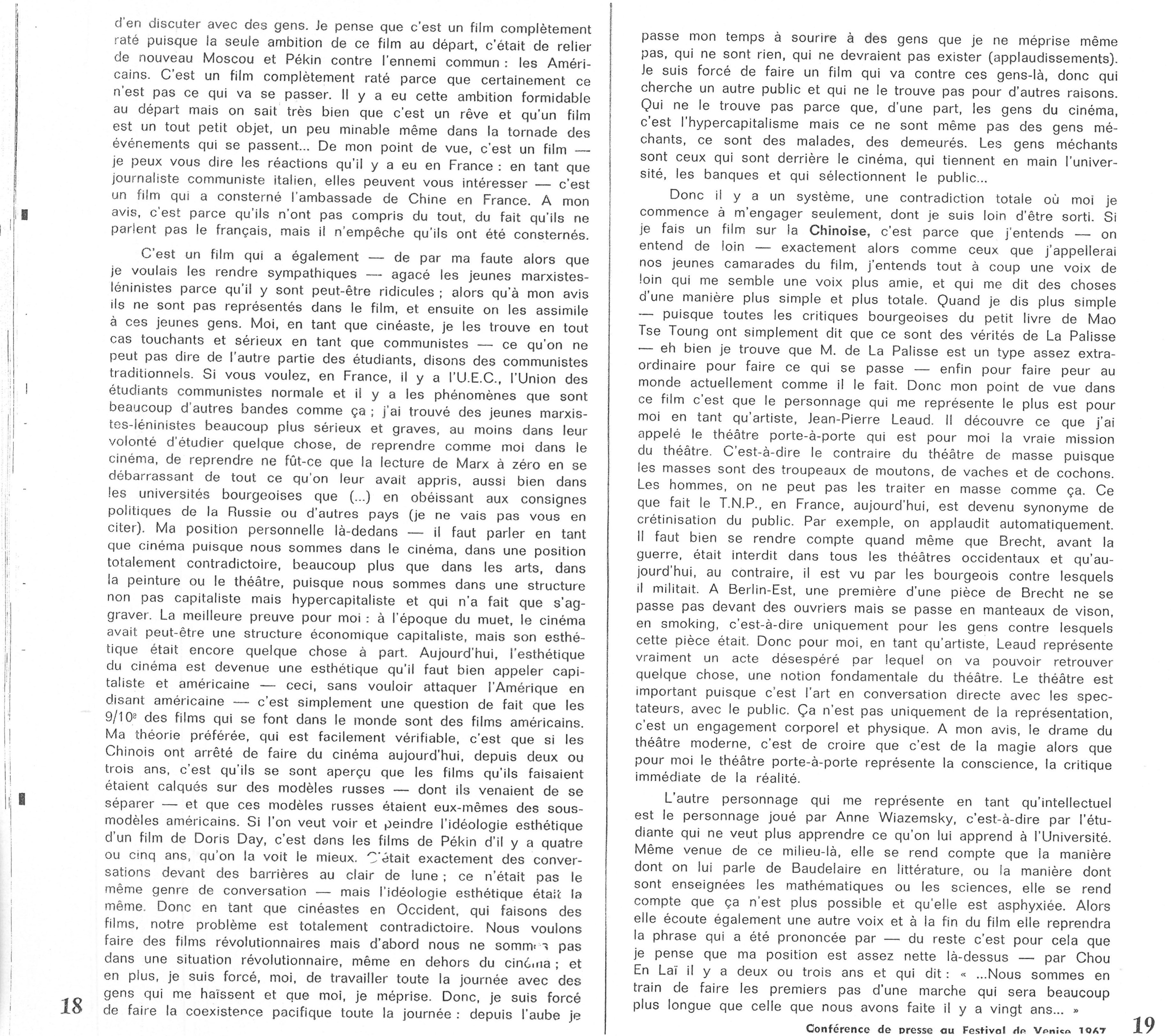 Godard Interventions autour du film La Chinoise de Jean-Luc Godard Conférence de presse au Festival de Venise, 1967 Texte initialement paru dans la revue Jeune Cinéma n° 25, octobre 1967.