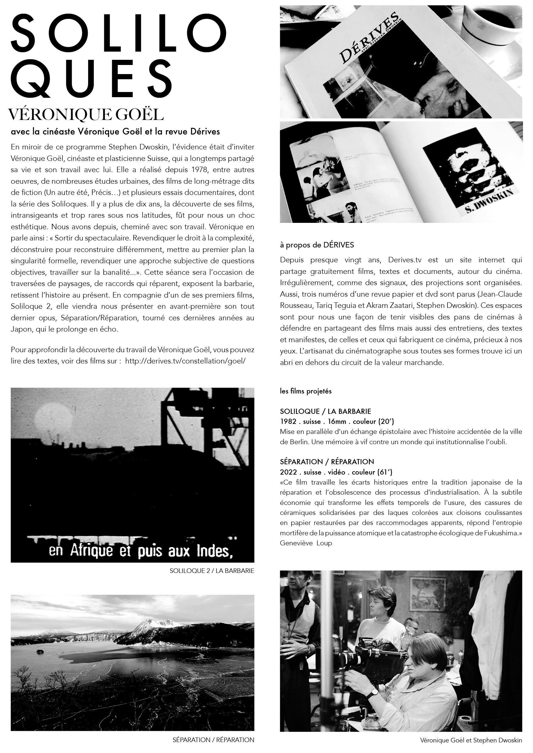En miroir du programme Stephen Dwoskin le 26 janvier 2023, l’évidence était d’inviter Véronique Goël, cinéaste et plasticienne Suisse, qui a longtemps partagé sa vie et son travail avec lui. Elle a réalisé depuis 1978, entre autres oeuvres, de nombreuses études urbaines, des films de long-métrage dits de fiction (Un autre été, Précis…) et plusieurs essais documentaires, dont la série des Soliloques. Il y a plus de dix ans, la découverte de ses films, intransigeants et trop rares sous nos latitudes, fût pour nous un choc esthétique. Nous avons depuis, cheminé avec son travail. Véronique en parle ainsi : « Sortir du spectaculaire. Revendiquer le droit à la complexité, déconstruire pour reconstruire différemment, mettre au premier plan la singularité formelle, revendiquer une approche subjective de questions objectives, travailler sur la banalité…». Cette séance sera l’occasion de traversées de paysages, de raccords qui réparent, exposent la barbarie, retissent l’histoire au présent. En compagnie d’un de ses premiers films, Soliloque 2, elle viendra nous présenter en avant-première son tout dernier opus, Séparation/Réparation, tourné ces dernières années au Japon, qui le prolonge en écho.