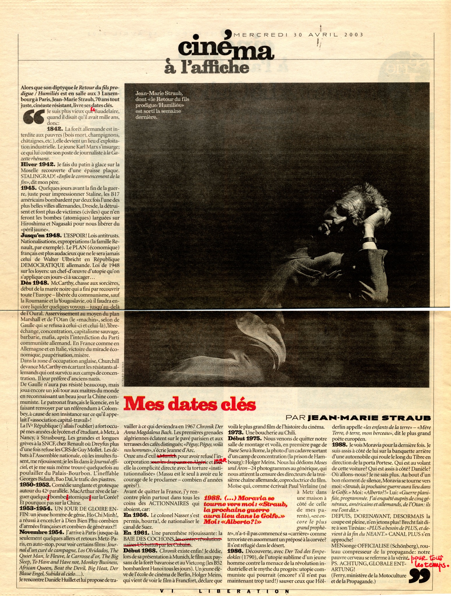 Texte initialement publié dans Libération, le 30 Avril 2003 : Alors que son diptyque Le Retour du fils prodigue / Humiliés est en salle aux 3 Luxembourg à Paris, Jean-Marie Straub, 70 ans tout juste, cinéaste résistant, livre ses dates clés.